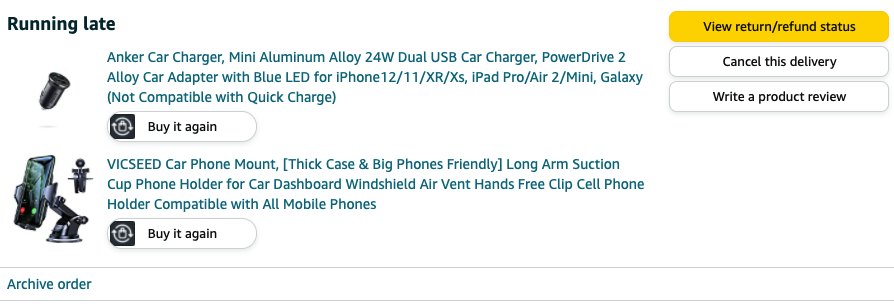 저는 지난 11월4일 아마존에서 물건을 구매했습니다. 하나는 차량용 휴대폰 마운트, 나머지 하나는 차량용 휴대폰 충전기였습니다. 요새 저는 꽤 제 차 내부를 쾌적하게 관리하는 재미가 붙어서 차량용 청소기부터 이것저것 구매하고 있는 상황이었습니다. 마운트와 충전기까지 있으면 더 편하고 좋겠다는 생각에 구매를 하게 됐습니다(사실 자석 거치대가 있고, 충전기가 있지만 고장남). 아마존 프라임을 이용하고 있는 저는 다음날인 11월 5일 배송되어야 할 제품이 집에 도착하지 않음을 알게 됐습니다. 사실 11월 5일 저는 병원에서 하루 종일 12시간 일을 하고 집에 왔기 때문에 피곤해서 바로 잤고, 그다음 날 6일에 확인을 해보았지만 택배가 도착해 있지 않았습니다. 기다리면 오겠거니~ 하고서 7일이 됐고, 8일이 됐고, 9일이 됐습니다. 아마존 프라임을 이용하면 주문한 다음날까지 물건이 보통 도착을 하는데요, 시간이 너무 오래 걸리는 것을 보고 뭔가 잘못됐다는 걸 깨달았습니다. 지금 생각해보면 참 빨리도 알았네요 :)